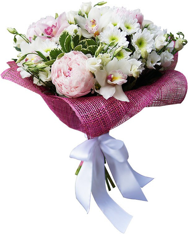 1 пион, 1 белая орхидея, 1 белая хризантема, 1 лизиантус, зелень, упаковка, лента2 пиона, 3 белых орхидей, 1 белых хризантем, 2 лизиантуса, зелень, упаковка, лента3 пиона, 5 белых орхидей, 3 белых хризантем, 5 лизиантуса, зелень, упаковка, лента